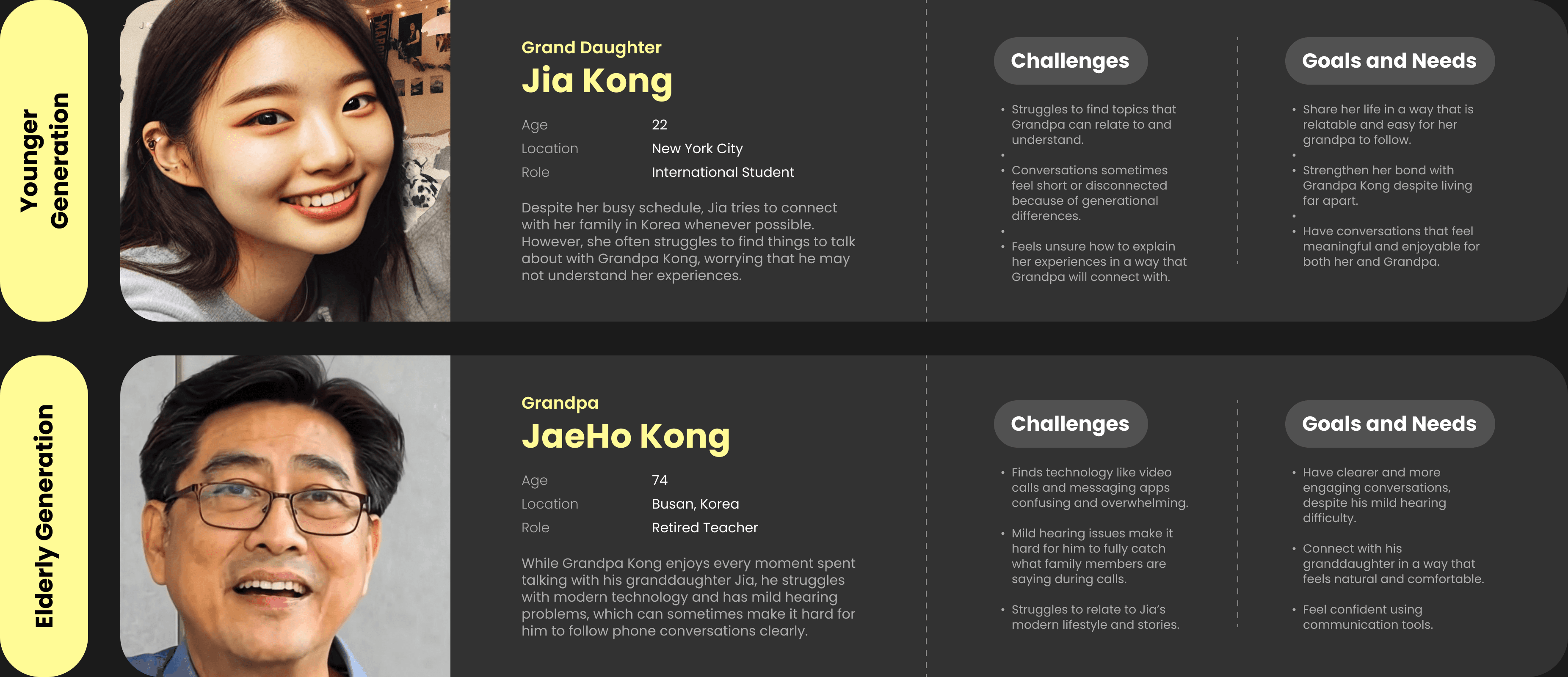 As we target the younger generation as our solution, our team developed two personas: Jia, who represents the younger generation, and Grandpa Kong, who represents the elderly family members.